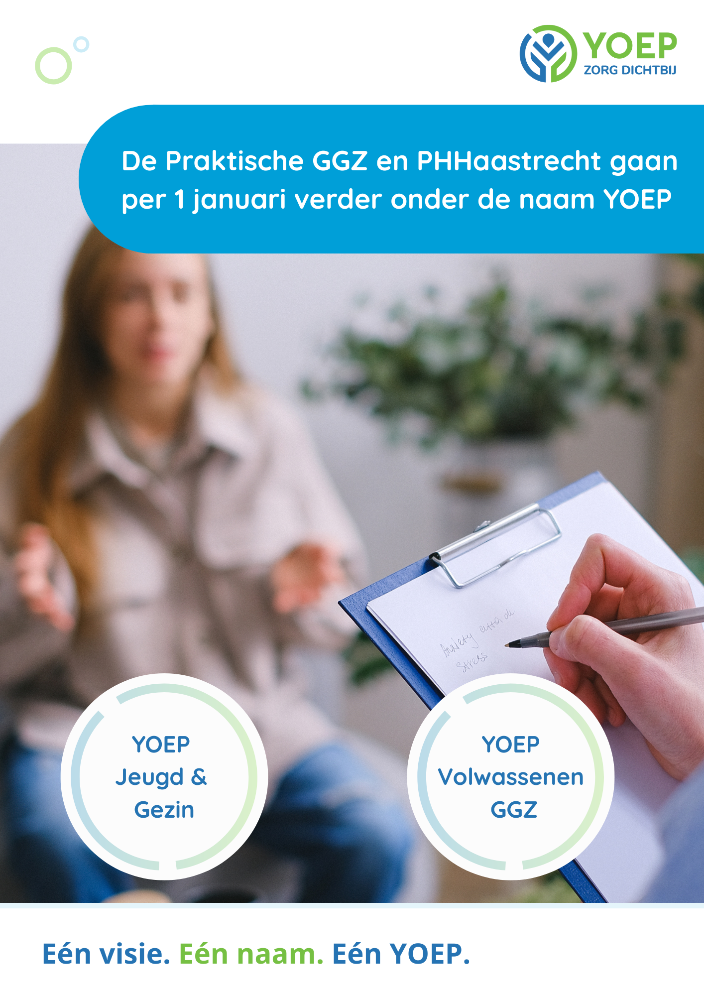 PHHaastrecht en De Praktische GGZ zijn al langere tijd onderdeel van de YOEP-groep, een netwerkorganisatie, die zich inzet voor de mentale gezondheid en het welzijn van kinderen, jongeren en volwassenen. Door verder te gaan onder één gezamenlijke naam, maken we duidelijker dat we één organisatie zijn met een gedeelde missie en visie.